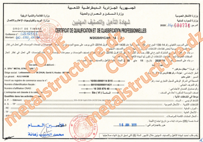 Nous avons la plaisir de vous annoncer que le Ministère de l’Habitat et de l’Urbanisme a délivré à Métal Structure le 16/06/2020 un certificat de qualification et de classement professionnelles catégorie 6.