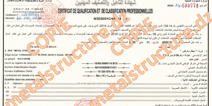 Nous avons la plaisir de vous annoncer que le Ministère de l’Habitat et de l’Urbanisme a délivré à Métal Structure le 16/06/2020 un certificat de qualification et de classement professionnelles catégorie 6.